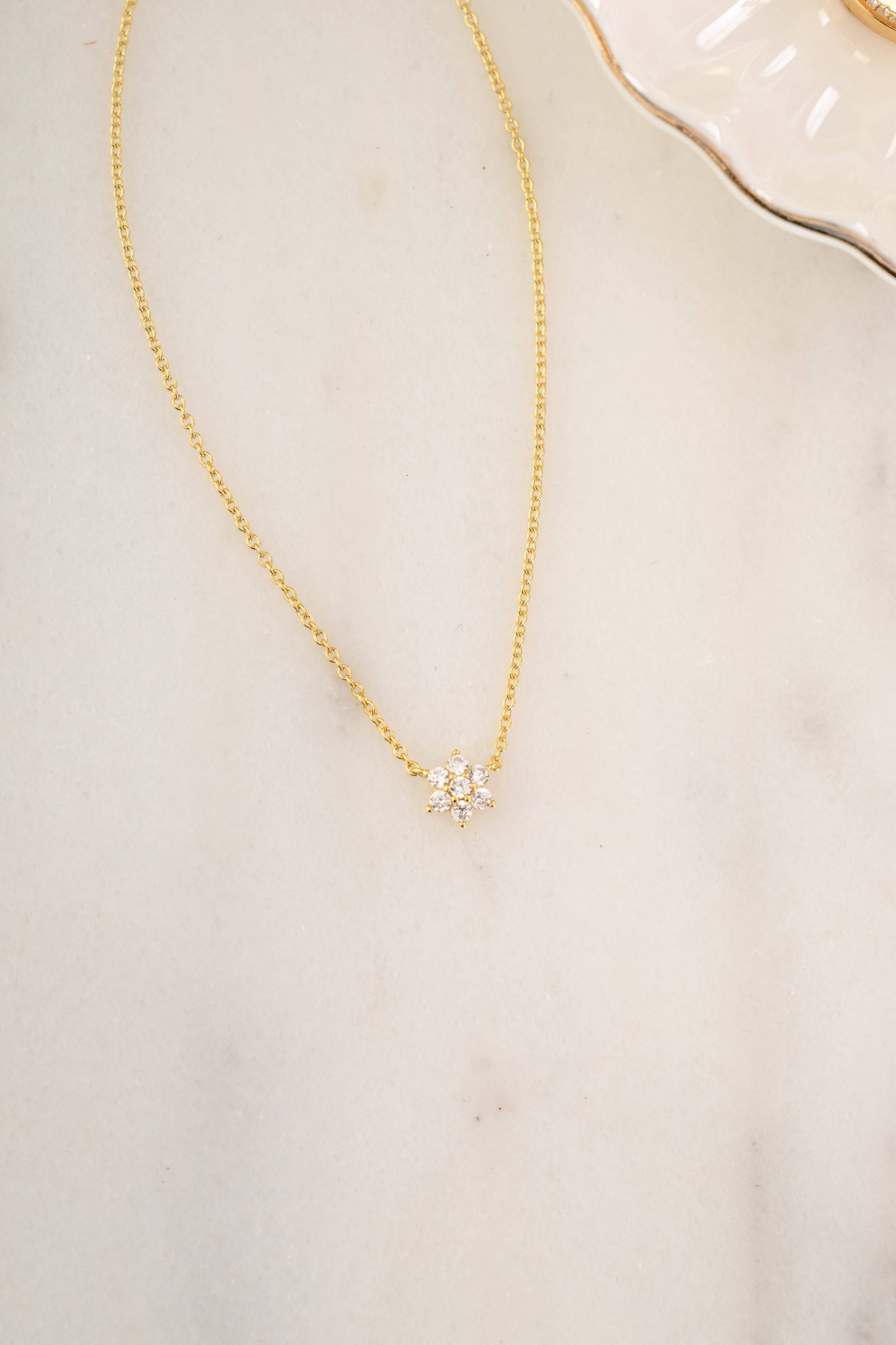 A dainty and feminine flower necklace that is perfect for stacking or beautiful on its own! Matching earrings are available so you can make this into a beautiful necklace earring set that can be worn as bridal jewelry, as bridesmaid gifts and much more! Super versatile and cute!