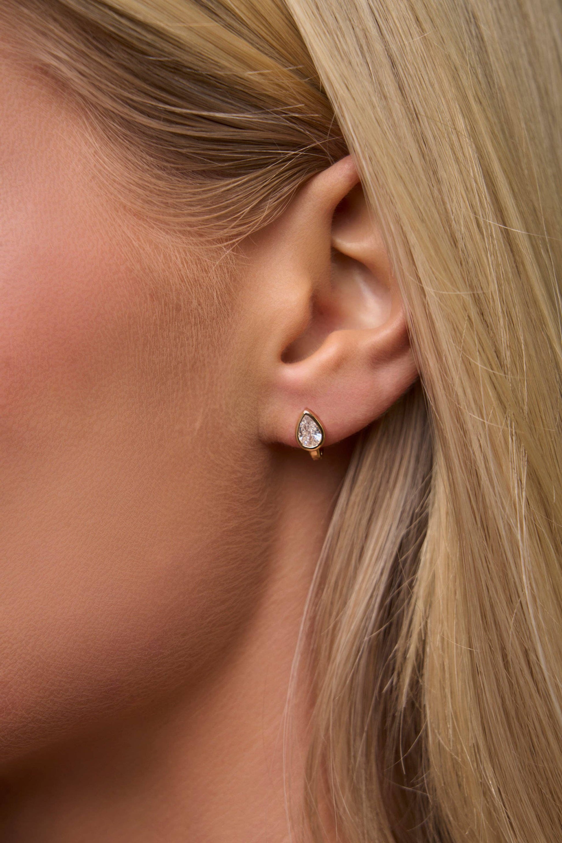 A clean, classic pear CZ stud crafted in a minimal bezel setting. Not quite a stud, not quite a huggie. The Stuggie lives in the sweet spot.